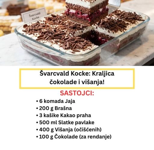 Kada poželite desert koji spaja intenzivan ukus čokolade, nežnost bele kreme i kiselkastu svežinu voća, Švarcvald kocke su nepogrešiv izbor. Ovaj recept je inspirisan čuvenom nemačkom tortom, ali u obliku kocaka koje su lakše za pripremu i idealne za serviranje u svakoj prilici.