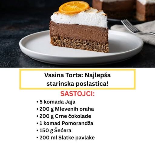 Vasina torta nije samo običan desert – ona je istinski klasik i ponos domaće poslastičarske tradicije. Smatra se jednom od najsofisticiranijih starinskih torti, a njena tajna leži u savršenom spoju bogatog biskvita od oraha, kremastog čokoladnog fila i osvežavajuće note pomorandže. Krunisana vazdušastim šamom ili slatkom pavlakom, ova torta je simbol proslava i posebnih trenutaka.