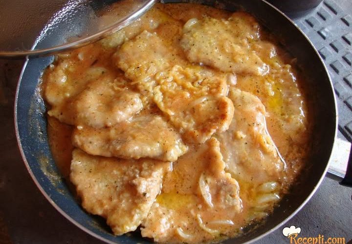 Onda dosoliti ili staviti suvi biljni začin, vratiti šnicle u sos i na tihoj vatri krčkati dok šnicle ne omekšaju.