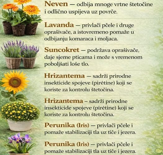 Cvijeće nije samo ukras. Pravilno odabrane cvjetnice mogu značajno pomoći vašem vrtu da napreduje, bude zdraviji i produktivniji. Neven, lavanda, suncokret, hrizantema, perunika i ljubičica su dokaz da priroda zna najbolje rješenje.