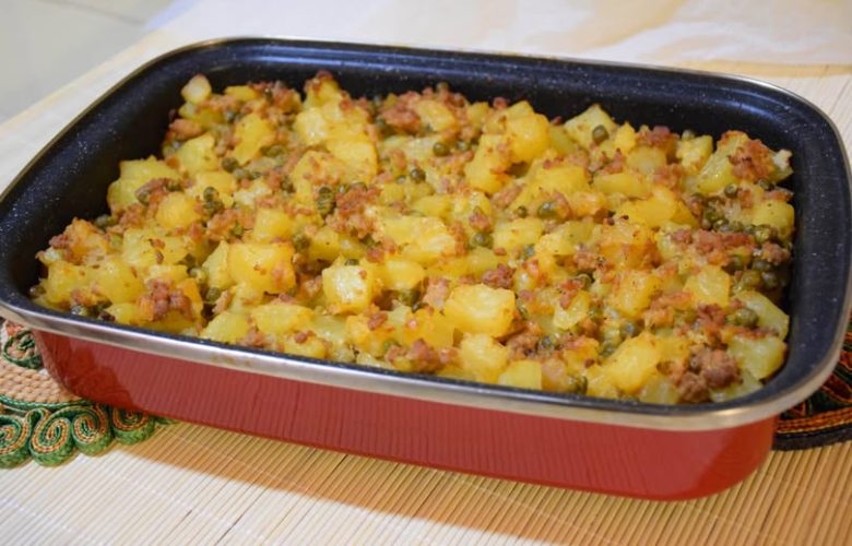 Dok dinstate meso, očistite krompir i iseckajte ga na sitne kocke. Očistite i jabuke (možete preskočiti ako ne volite kombinaciju, ali – budite otvorenog duha i probajte ovako, ukusno je ), pa ih isecite na kriške. Grašak ocedite.