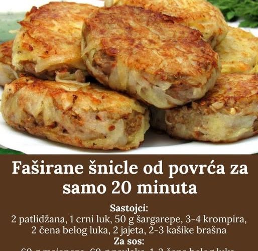 Priprema: Izrendajte patlidžan i crni luk, pa procedite od viška vode. Dodajte rendanu šargarepu, mleveni beli luk i brašno. Dobro sjedinite, pa dodajte umućeno jaje. U drugoj posudi pomešajte rendani krompir, posolite i pobiberite i dodajte jaje. Dobro sjedinite. Sipajte krompir u ruku i lepo rasporedite, zatim dodajte smesu sa povrćem, preko još jednu kašiku smese od krompira i lepo zatvorite. Ispržite, pa poređajte u vatrostalnu posudu i ispecite na 150°C oko 15-20 minuta. Pomešajte majonez, pavlaku, mleveni beli luk i seckanu mirođiju. Poslužite uz lažne faširane šnicle.