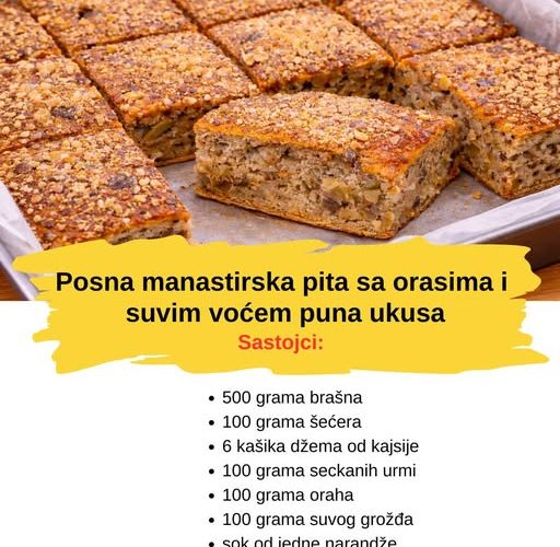 Ako volite jednostavne posne koji se brzo pripremaju, ova manastirska pita je pravi izbor. Bogata kombinacija oraha, suvog grožđa, urmi i daje joj posebnu sočnost i aromu, dok miris cimeta i citrusne note čine ovaj neodoljivim. Idealan je za dane posta, ali i kada želite lagan i domaći desert bez mnogo komplikacija.
