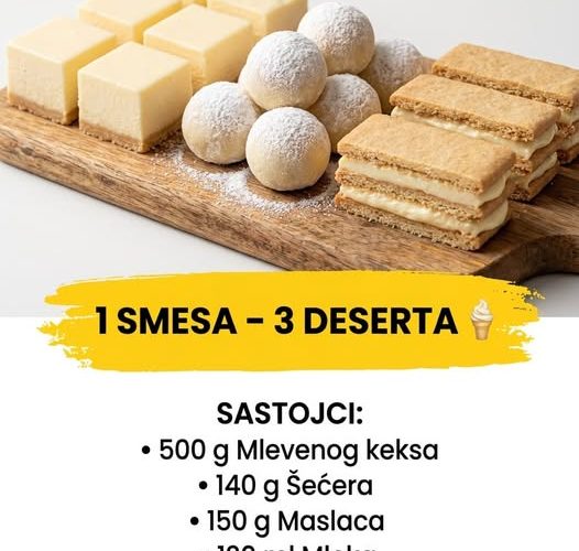 Kao što možete videti na fotografiji, od neverovatno jednostavnih sastojaka dobićete tri potpuno različita deserta: (1) savršeno precizne kocke koje podsećaju na mini cheesecake, (2) meke, snežne kuglice koje se tope u ustima i (3) klasične slojevite keks štanglice sa bogatim kremom. Priprema je brza, a rezultat je tacna puna profesionalnih poslastica!