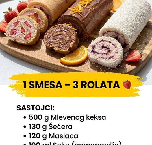 Kada dođu topliji dani, teške pečene torte rado menjamo za brze, osvežavajuće voćne deserte. Ovaj recept je apsolutni fenomen jer vam omogućava da od samo jedne jednostavne baze od keksa napravite tri potpuno različita, vizuelno prelepa i neopisivo ukusna rolata.