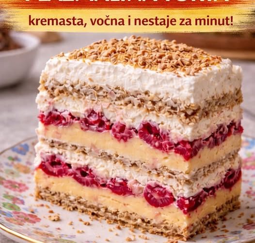 Torta treba da odstoji u frižideru najmanje nekoliko sati, idealno preko noći, da kore omekšaju i upiju krem. Kada se presiječe, dobijate savršene slojeve – mekane kore, kremasti fil i sočne maline.