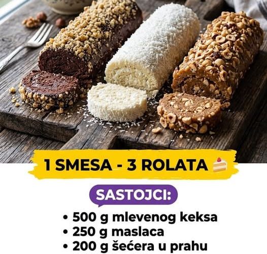 Kao što možete videti na fotografiji, od jedne jedine baze sa mlevenim keksom kreirali smo tri potpuno različita vizuelna i ukusna doživljaja: tamni čokoladni rolat posut orasima, snežno beli rolat sa kokosom i hrskavi rolat sa pečenim lešnicima. Svaki presek je savršeno precizan, a tekstura kolača je sočna i kompaktna. Prateći naše korake, uspećete da napravite ovu slatku čaroliju za tili čas.