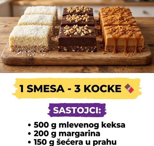 Kao što možete videti na fotografiji, od jedne osnovne baze sa mlevenim keksom kreirali smo tri potpuno različita vizuelna i ukusna doživljaja: nežne bele kocke sa kokosom, bogate tamne kocke sa čokoladom i orasima, i neverovatno sočne kocke sa prelivom od karamele. Svaki presek je savršeno precizan i stabilan. Prateći naše detaljne korake, uspećete da napravite ovu slatku magiju za tili čas.