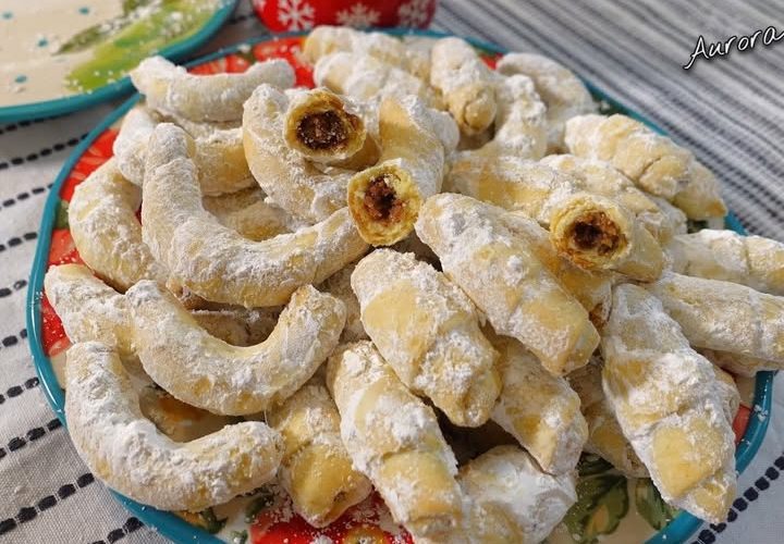 Od testa razvucite koru i secite trougliće. Na svaki trouglić stavite punjenje od oraha i uvijte kiflicu.