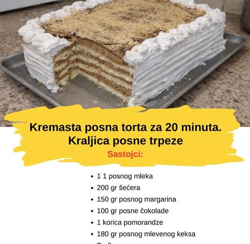 Kremasta posna za samo 20 minuta! Najbolji recept za brzu, jednostavnu i preukusnu posnu tortu koja uvek uspe i postaje prava kraljica posne trpeze. Bez , bez , bez margarina – a toliko bogata, lagana i savršeno kremasta da će nestati odmah sa stola.