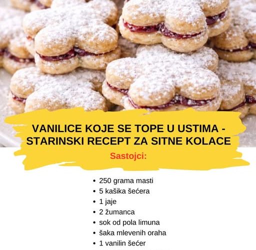 Vanilice su jedan od onih kolača koji bude najlepše uspomene na domaću kuhinju, praznike i miris sveže pečenih kolačića. Ovaj provereni recept za vanilice daje mekane, mirisne i nežne kolače koji se doslovno tope u ustima. Priprema je jednostavna, sastojci su skromni, a rezultat je savršen desert za svaku priliku – od slave i praznične trpeze do svakodnevnog uživanja uz kafu ili čaj.