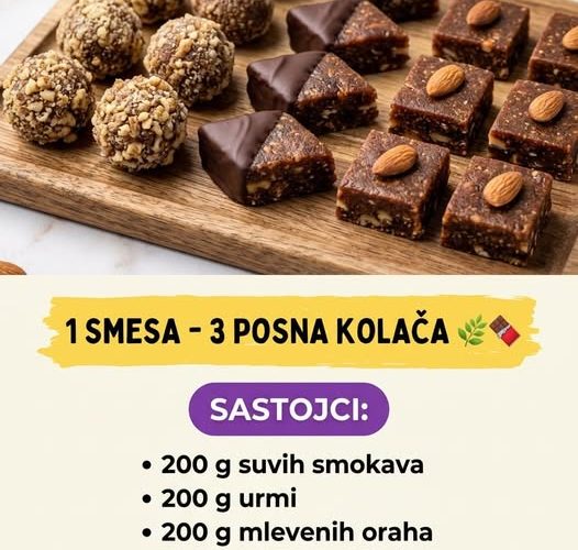 Glavni akteri ovog recepta su urme i suve smokve, koje daju savršenu lepljivu teksturu i prirodnu slatkoću, dok orasi donose onaj pravi, bogati starinski ukus. Od jedne iste smese, za samo 15 minuta, napravićemo tri vizuelno potpuno različita i elegantna deserta. Pratite detaljno uputstvo ispod.