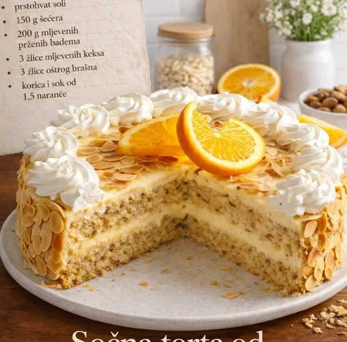 Stranice obložite lagano tostiranim listićima badema, a po želji dekorirajte šlagom.