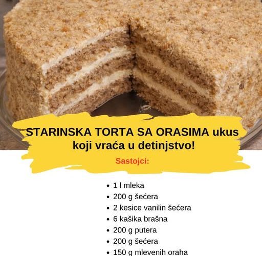 Ova torta je pravi klasik – mekana, sočna i puna ukusa oraha. Najlepša je kada malo odstoji u frižideru, jer tada svi slojevi savršeno omekšaju i sjedine se u jedan bogat, starinski desert koji svi vole.