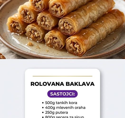 Rolovana baklava je jedan od najdražih i vizuelno najprivlačnijih oblika ovog proslavljenog orijentalnog deserta. Za razliku od klasične baklave koja se slaže u pleh u ravnim slojevima, rolovana verzija nudi još veću hrskavost i predivan, rustičan naborani izgled. Svaki komad je prepun izdašnih oraha, a specifična struktura testa savršeno upija slatki sirup, čineći svaki zalogaj neodoljivo sočnim iznutra, a hrskavim spolja.