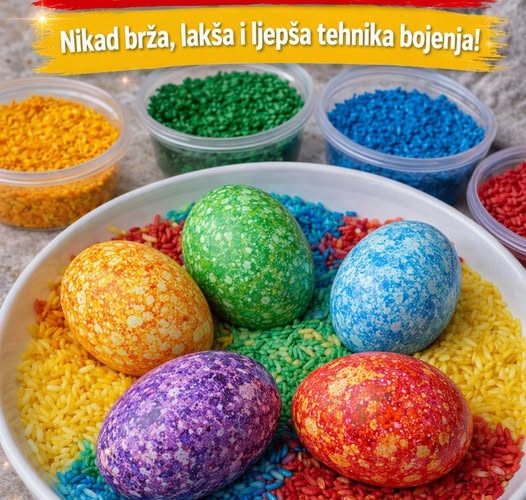 SASTOJCI: 10 jaja, 300–400 g riže (podeliti u više činija), prehrambene boje (crvena, žuta, plava, zelena…), 2–3 kašike alkoholnog sirćeta, voda po potrebi, kesice ili male posude sa poklopcem, rukavice.