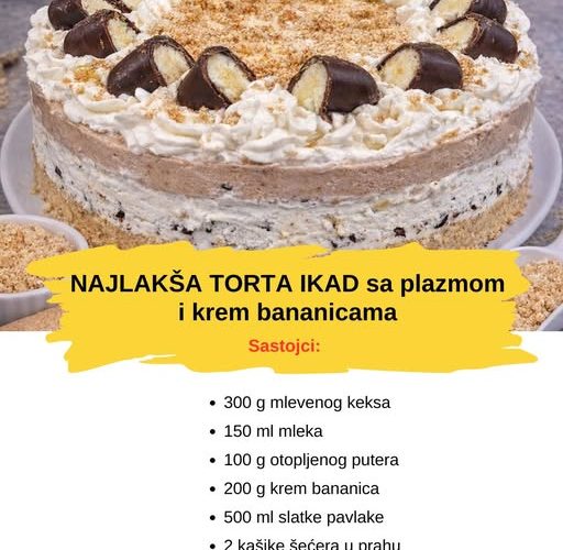 Za ovu brzu i kremastu tortu potrebno je da pripremite sledeće sastojke: 300 g mlevenog keksa (plazma ili sličan), 150 ml mleka, 100 g otopljenog putera, 200 g krem bananica, 500 ml slatke pavlake, 2 kašike šećera u prahu i 1 kesica vanilin šećera. Za dekoraciju možete dodati još 100 g krem bananica i malo mlevenog keksa.