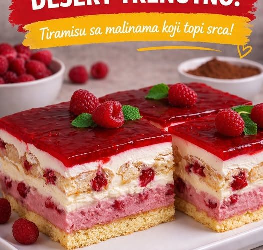 Na kraju pripremite želatin ili preliv: u 200 ml soka od maline ili vode sa šećerom dodajte 1 kesicu želatina (ili preliv za torte) i prelijte preko kolača. Ostavite u frižideru minimum 4 sata da se stegne. Kada se seče, slojevi su savršeno vidljivi, a ukus osvežavajući i kremast – pravi hit desert!