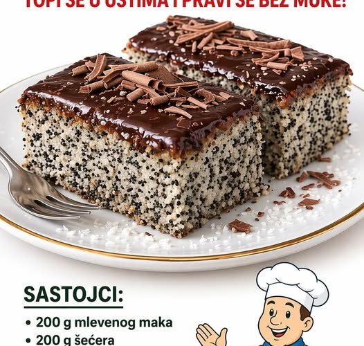 Za ovaj izuzetno mekan i sočan posni kolač pripremi sledeće sastojke. Za biskvit: 200 g mlevenog maka, 200 g šećera, 250 ml vode, 100 ml ulja, 200 g brašna, 1 kesica praška za pecivo i 1 kesica vanilin šećera. Za preliv (da kolač bude još sočniji): 200 ml vode i 3 kašike šećera. Za glazuru: 100 g crne čokolade i 3 kašike ulja. Po želji, za dekoraciju: malo rendane čokolade.