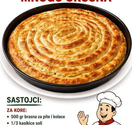Priprema: Zamijesiti mekano i glatko tijesto od brasna, soli, ulja i vode. Podijeliti na pola (jufke 400 gr) i premazati puterom, pokriti celofanom i ostaviti da odstoji na toplom dok spremamo nadjev.
