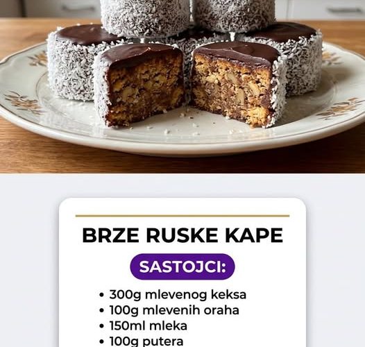 Ove brze ruske kape su fantastična, pojednostavljena verzija tradicionalnog kolača koja ne zahteva pečenje kora niti kuvanje komplikovanih filova. Spajaju sve omiljene ukuse originala – bogatu čokoladu, aromatične orahe i osvežavajući kokos – u kompaktnom zalogaju koji se pravi za tili čas. Presek ovog deserta je vizuelno veoma atraktivan, sa vidljivim komadićima oraha i prepoznatljivim kontrastom između tamne baze i belog kokosa.
