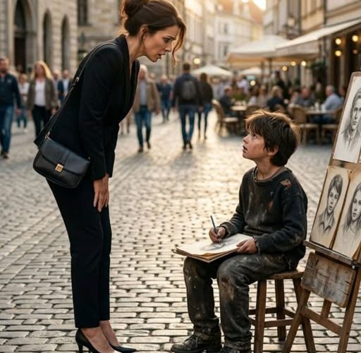 Na malom trgu, među uličnim umetnicima, ugledala je dečaka koji je crtao portrete prolaznicima. Bio je skromno obučen, tih i fokusiran.