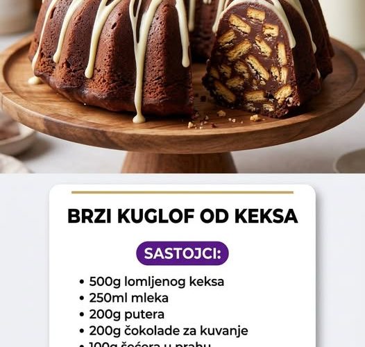 Ovaj brzi kuglof od keksa je fantastičan, vizuelno impresivan desert koji ne zahteva ni trunku vašeg vremena provedenog pored rerne. Spoj bogate, guste čokoladne mase i komadića lomljenog keksa stvara predivnu teksturu koja podseća na najfinije čokoladne praline. Zahvaljujući elegantnom obliku kuglofa i kontrastnoj glazuri od bele čokolade, ovaj kolač izgleda kao pravo profesionalno poslastičarsko remek-delo.