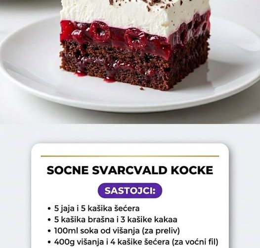 Sočne Švarcvald kocke su neverovatno praktična i izdašna verzija čuvene Švarcvald torte. Ovaj kolač donosi prepoznatljiv, elegantan spoj tamnog kakao biskvita, osvežavajućih kiselkastih višanja i nežne slatke pavlake. Zahvaljujući prelivu od soka, biskvit je izuzetno sočan i topi se u ustima, dok mu presek izgleda veoma profesionalno sa jasno definisanim crvenim, belim i braon slojevima.