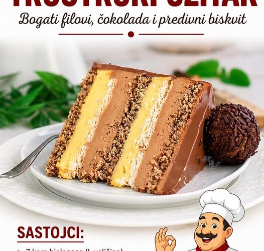 Rezultat je bogata, slojevita torta sa savršenim spojem vanilije, čokolade i oraha – pravi trostruki užitak na maksimumu